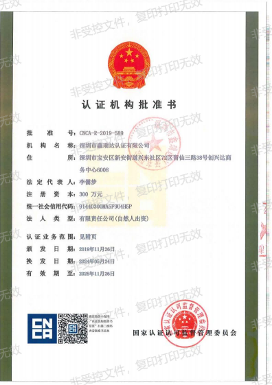 深圳市鑫瑞達(dá)認(rèn)證有限公司(SRT)是經(jīng)國(guó)家登記主管機(jī)關(guān)依法登記注冊(cè)、經(jīng)中國(guó)國(guó)家認(rèn)證認(rèn)可監(jiān)督管理委員會(huì)(CNCA)批準(zhǔn)的第三方認(rèn)證機(jī)構(gòu)(批準(zhǔn)號(hào):CNCA-R-2019-589)。公司愿景致力于創(chuàng)造一個(gè)公平、公正、有愛(ài)、自律的認(rèn)證環(huán)境,為企業(yè)提供專業(yè)的品牌認(rèn)證、售后服務(wù)認(rèn)證等多維一體的專業(yè)認(rèn)證服務(wù)公司。為企業(yè)提供切實(shí)可行的管理提升方案和以及誠(chéng)實(shí)守信的做人原則是SRT全體同仁的行事準(zhǔn)則及設(shè)立初心,集行業(yè)內(nèi)外優(yōu)秀人才熱忱服務(wù)優(yōu)秀企業(yè),并致力于為企業(yè)提供切實(shí)可行的管理培訓(xùn)和管理方案。SRT總部設(shè)在中國(guó)深圳,現(xiàn)有認(rèn)證人員二十余人,其中審核員有十余人。